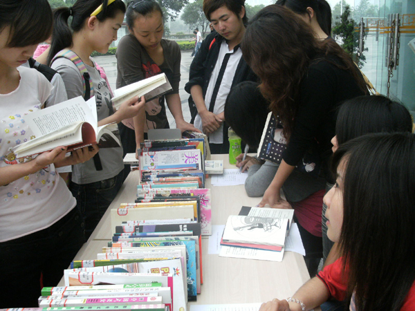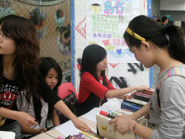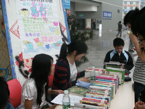 5月7-8日,第二届“书香校园”读书月活动之一的“易书”活动在新都校区食堂外广场进行。易书,即交换书籍。同学可以拿着自己已经看过了的书来换没有看过的书,这样同学手中的书就得到了合理而又充分的再次利用。此次“易书”活动为期两天,两天里易书将近一百册,取得了不错的效果。易书的同学来自本校区的各个院系,交换的书也是类型多样。